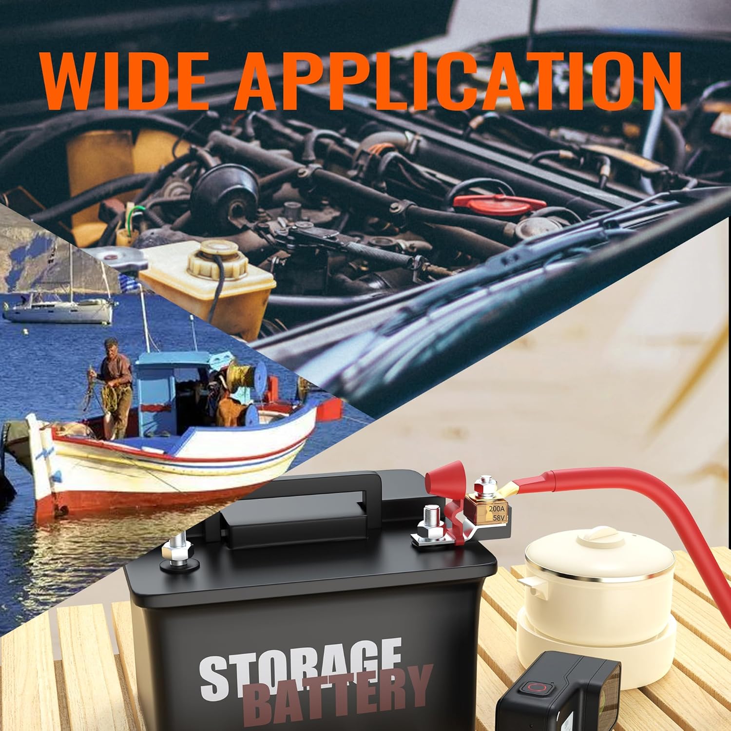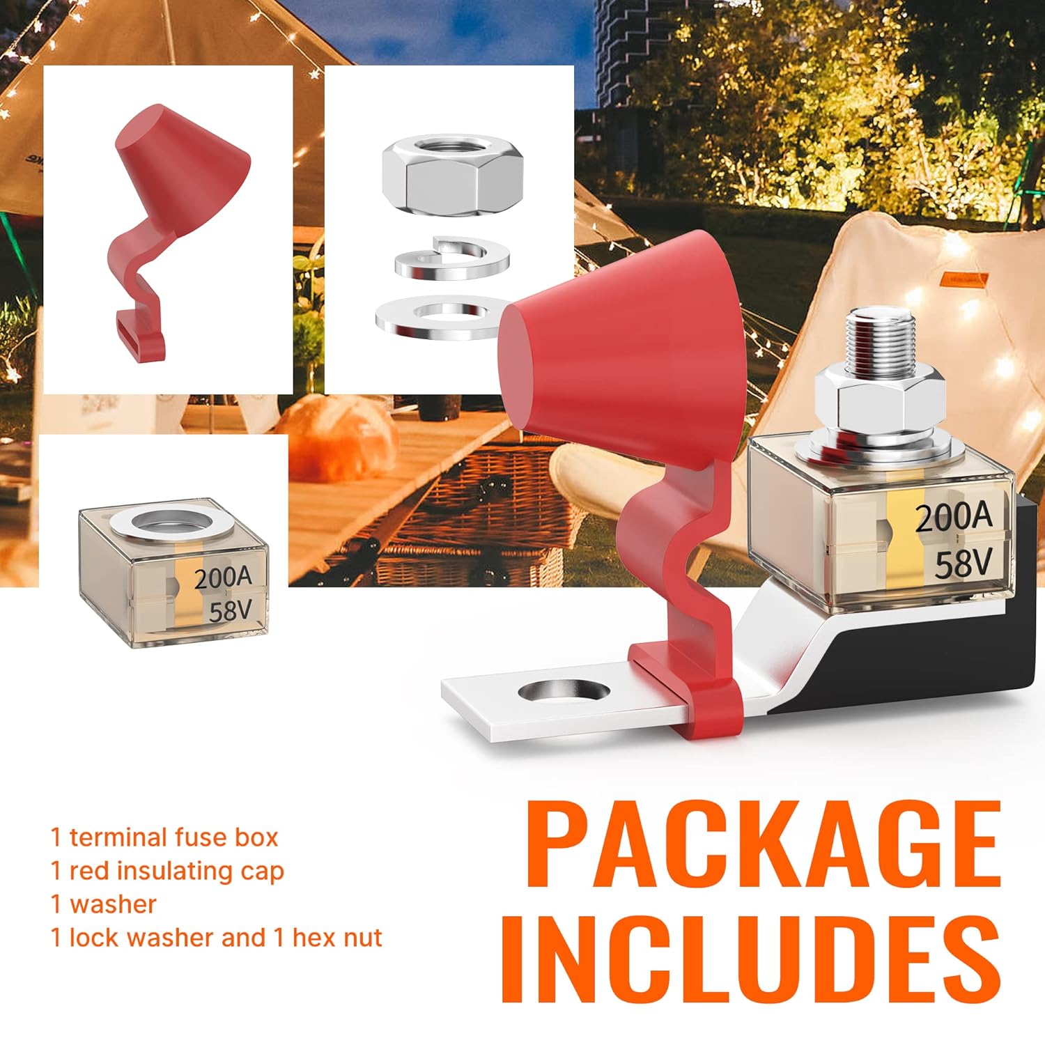 Product Type: Fuse rated current: 200A; Maximum rated voltage: 58V; Stud Size: 5/16"(M8); Terminal mounting hole: 3/8"(M10) Excellent Quality: The main material of this battery terminal fuse block kit is thermoplastic PPS, studs and nuts are made of stainless steel for high temperature resistant and good electrical conductivity Easy to Use&Carry: The simple construction of this mrbf terminal fuse block makes it very easy to install the device in the car battery through the safe connection of the fuse holder. The small size fuses can also save installation space What You Get: Package includes 1x200A terminal fuse box, 1xred insulating cap, 1xwasher, 1xlock washer and 1 hex nut Wide Application: This marine rated terminal mount fuse block kit can be widely used in new energy vehicles, RVs, cruise ships, cranes, batteries, charging piles and other DC main power