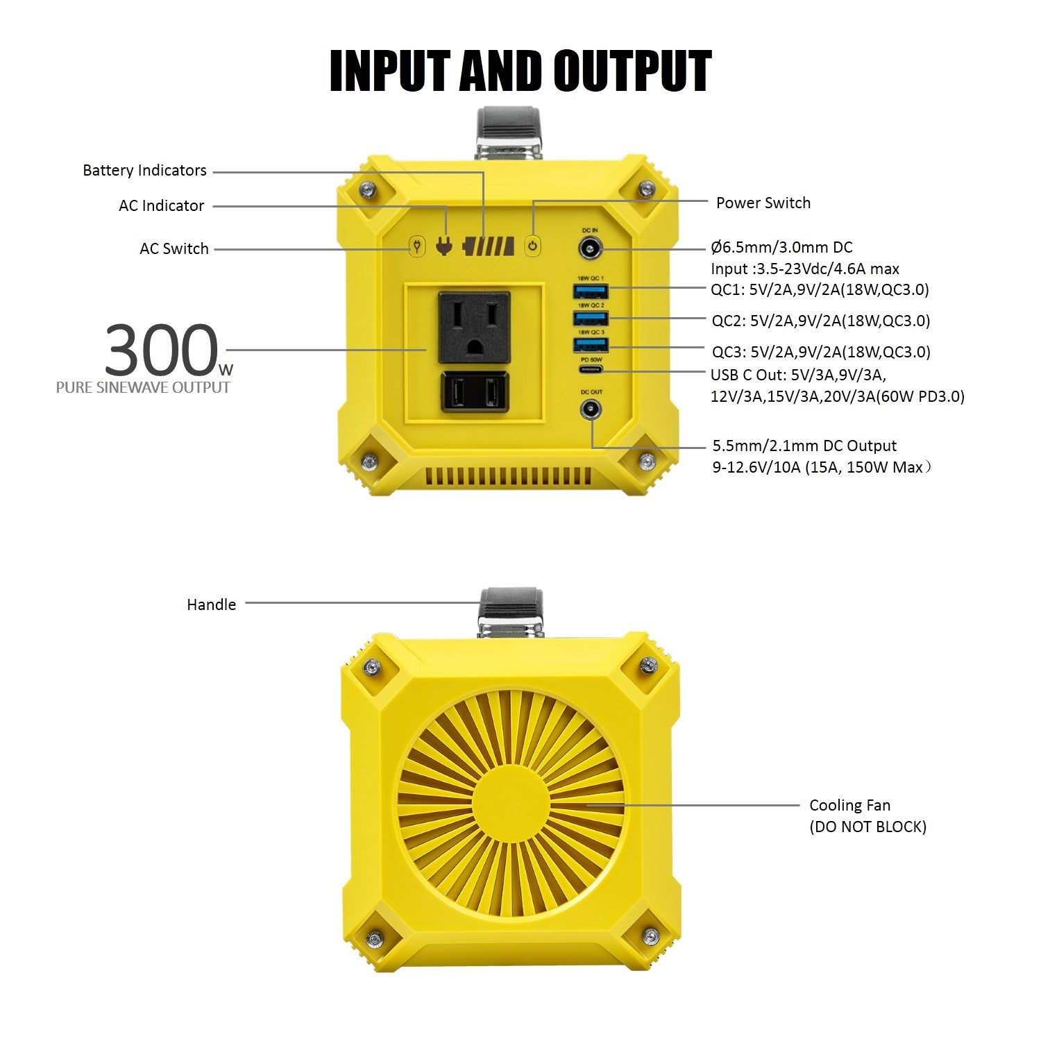 Adapter: DC15V/3A | Power station can be charged with 100-240V wall outlet (AC ports provide 110V output). |