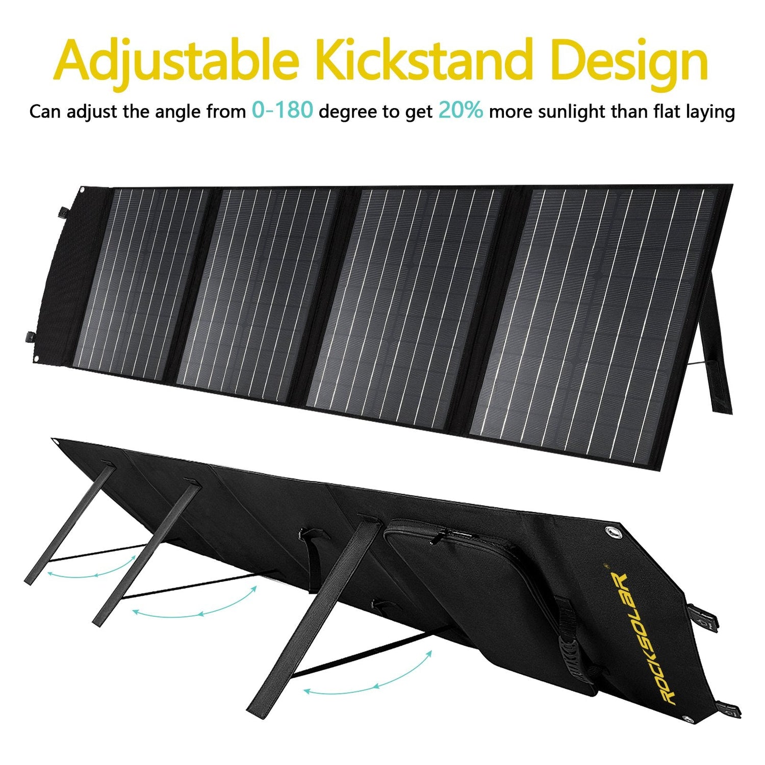 • High Efficiency: 100W rating; adjustable kickstands for optimal sunlight.